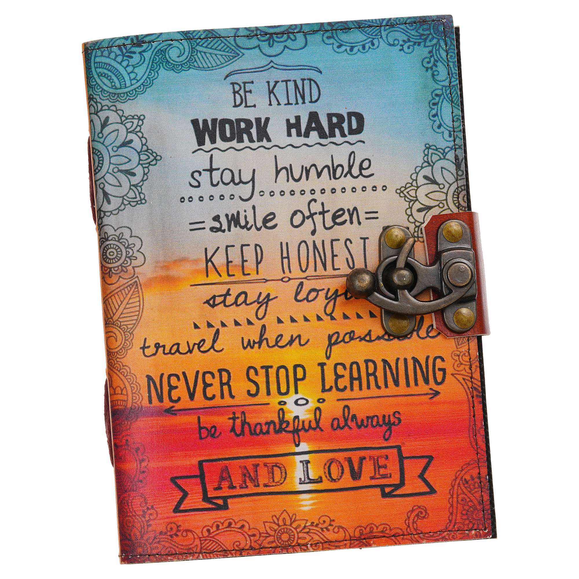 vintage handmade leather journal. Crafted with genuine leather, it radiates authenticity and charm, perfect for those who appreciate classic craftsmanship. The premium antique lock closure adds a touch of elegance and security, ensuring your thoughts and memories are safeguarded within its pages. Inside, you’ll discover 200 White handmade pages, providing ample space for your musings, sketches, and stories to unfold. Whether it’s for journaling, sketching, or planning, this versatile journal is a timeless companion for your creative endeavors. Treat yourself or a loved one to this exquisite piece, a celebration of tradition and creativity